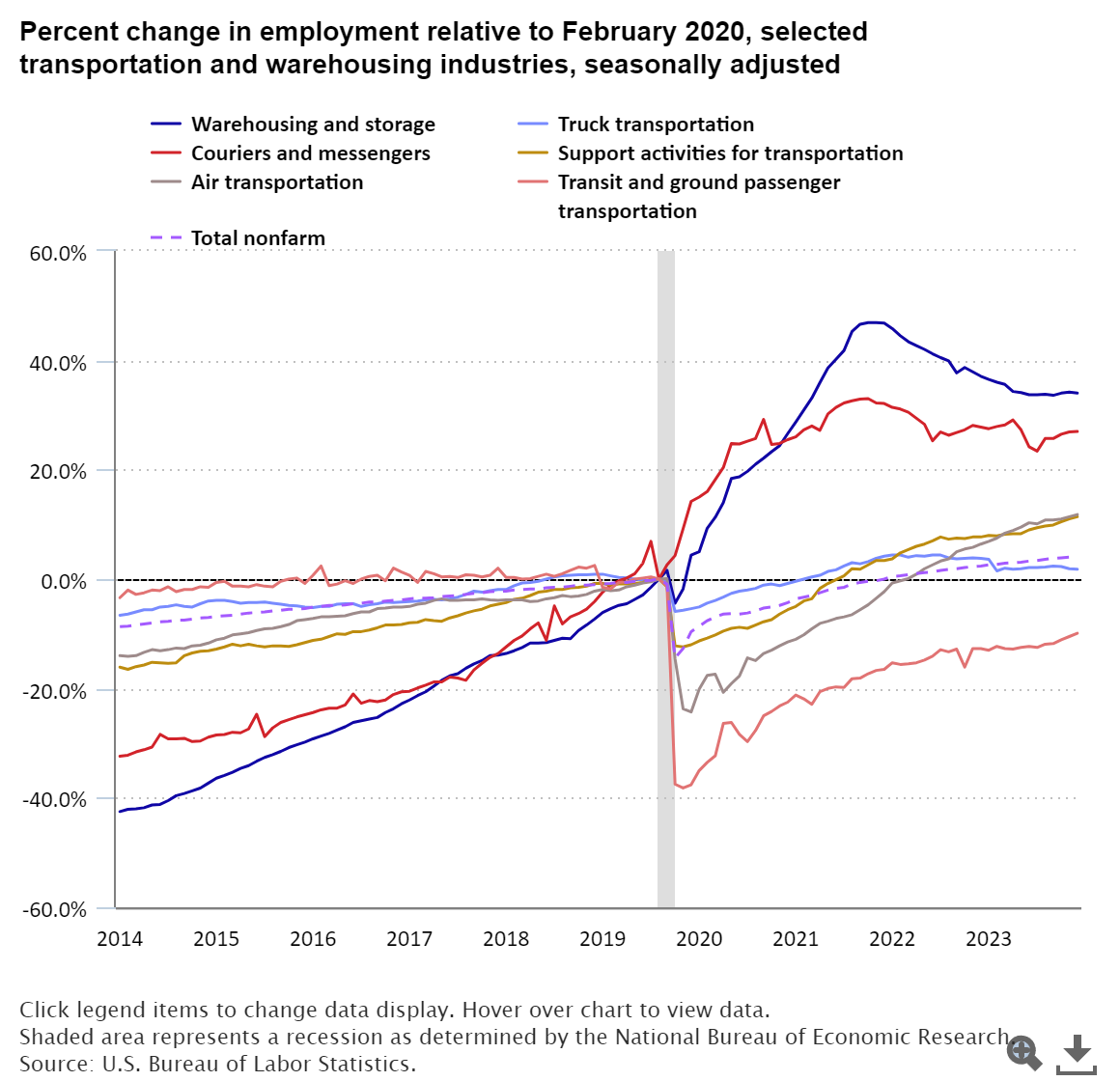 July 30, 2024 News Release by BLS (Bureau of Labor Statistics, in the US Department of Labor), Seasonally Adjusted New Job Openings, New Hires and Separations have all been slightly decreasing or holding steady from June of 2022 to June of 2024 in most sectors, including Transportation, Warehousing & Utilities. While a casual observer might jump to the conclusion that the economy is obviously gradually slowing down and assume that fewer job openings means that the supply of labor is catching up with the demand, they would be gravely mistaken.